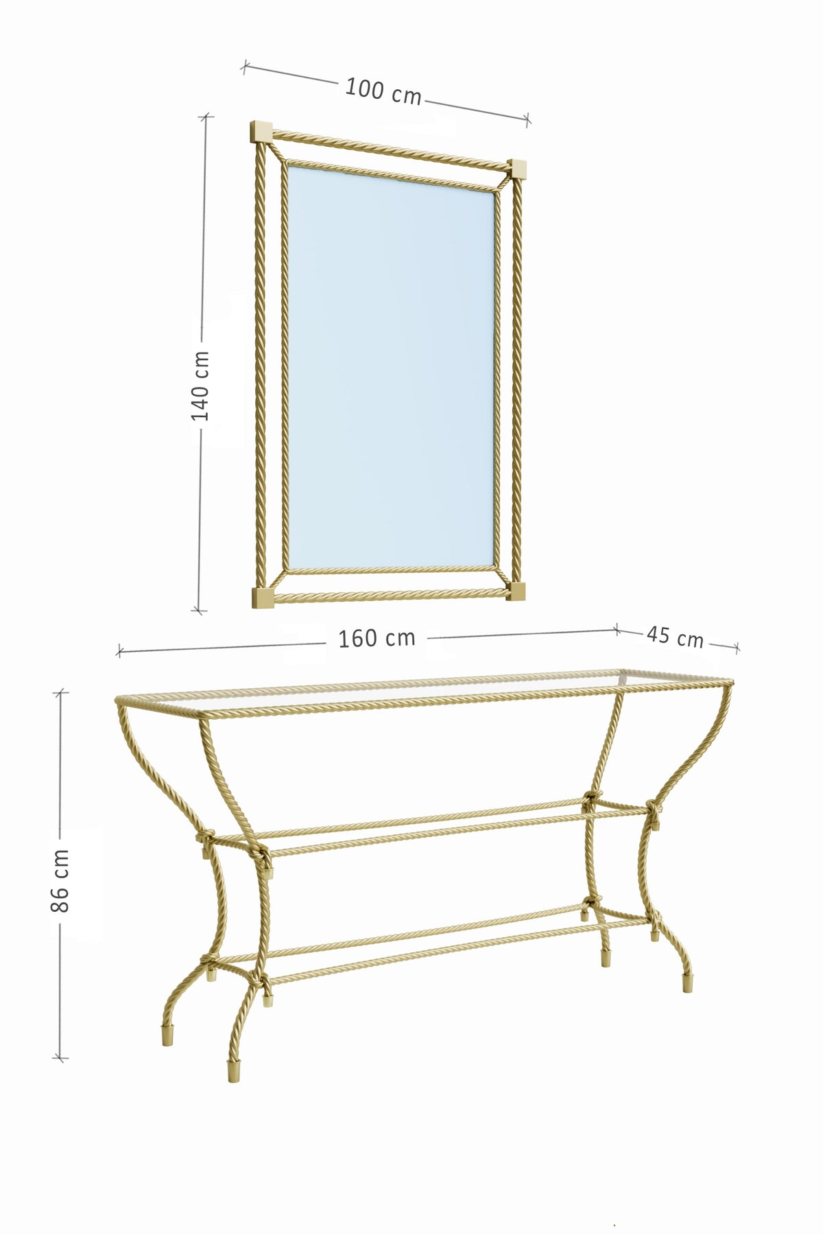 Noura console table in gold finish, featuring rope-inspired metalwork and paired with a matching mirror in a classical interior setting.
