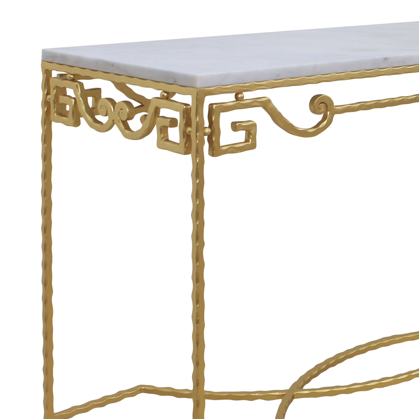 The Delphi Console Table features a marble top over a sculpted gold frame with greco motifs—graceful, balanced, and timelessly refined.