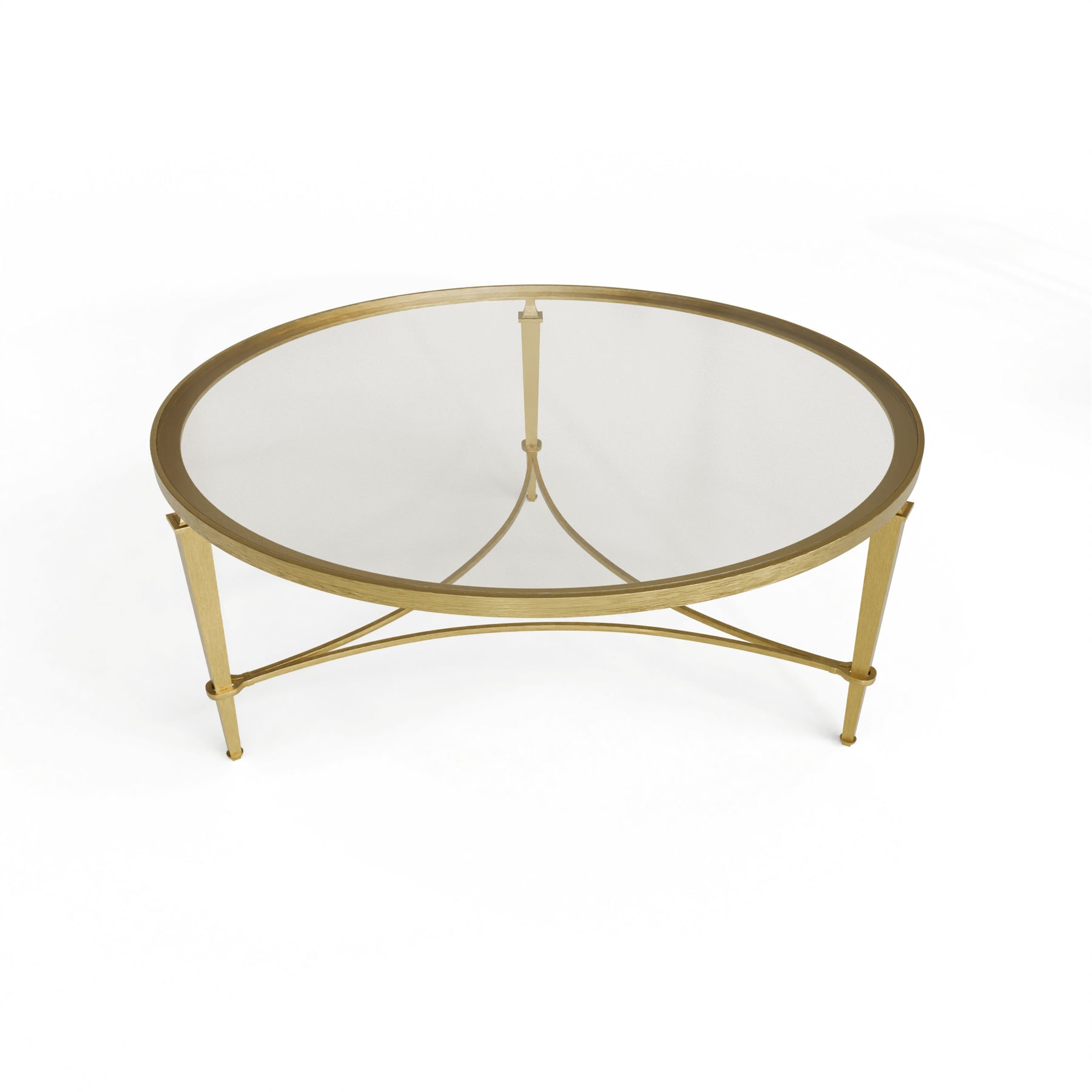 The Victoria Center Table stands on slender golden legs, gracefully supporting a clear glass top — crafted for timeless interiors. Pairs effortlessly with the Victoria Side Table.
